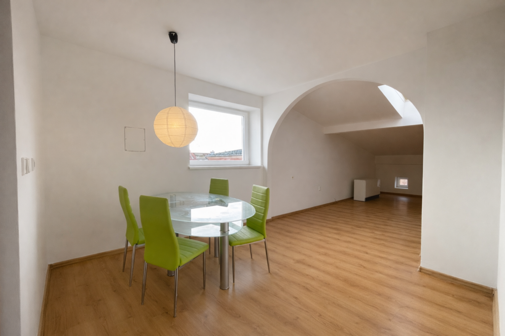 Podkrovní byt je po částečné rekonstrukci, působí velmi příjemně a nabízí dostatek prostoru jak pro pár, tak pro rodinu.