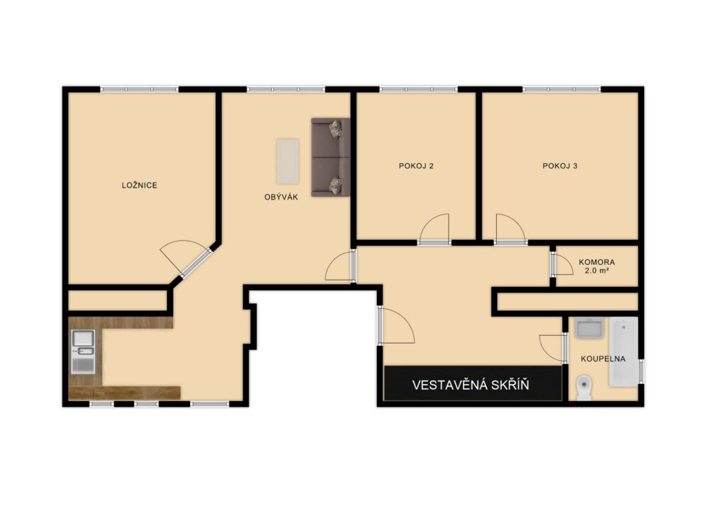 Byt se nachází ve 2. patře zděného bytového domu (bez výtahu). Velkou výhodou je, že je jediný byt na patře – maximální soukromí a klid.